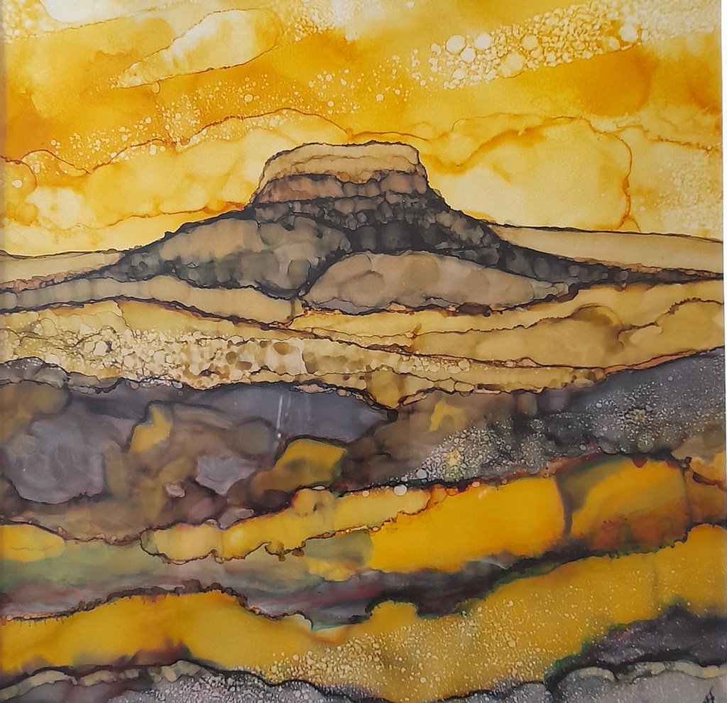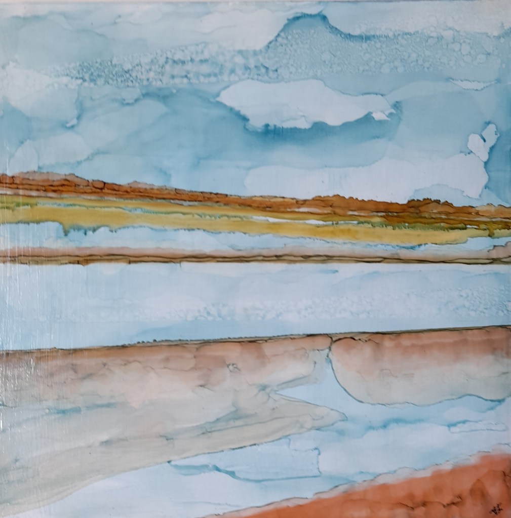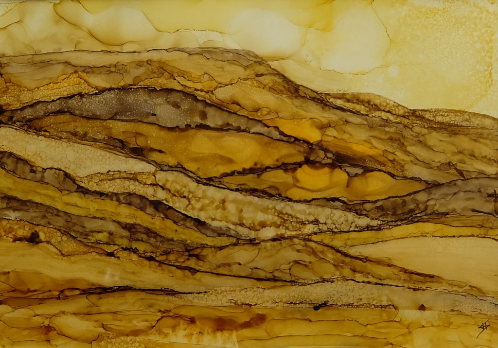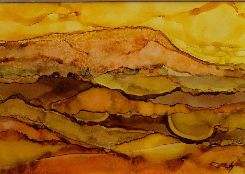 (99) Golden Hay Bluff 28×28 cm approx Alcohol Ink £175SOLD