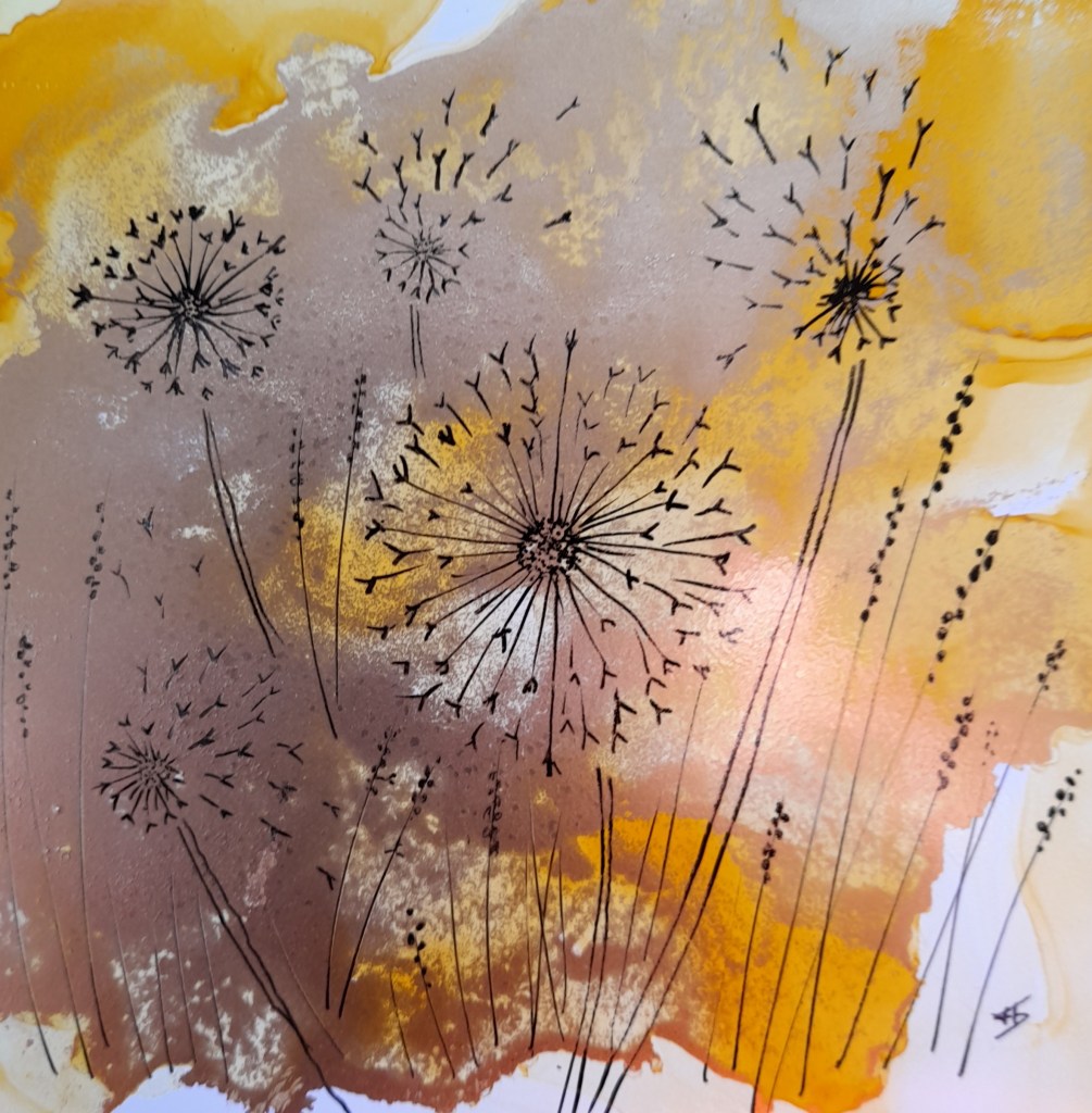 Well its sure is cold -7 this morning, my studio was registering -5 cold enough to stay indoors and read a good book. I switched on the oil filled radiator and made a swift exit back into the warmth. When I got back the studio was 21 degrees, the 2k watt heater works better than the 80 watt ! So as it was now warm the sun out and the alcohol and inks were running smoothly I got to work on “Gold d’lion”