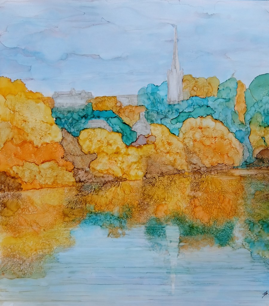 Quite a challenge to represent reflections of St Marys Church Ross on Wye and the banks of the river Wye but fun trying.